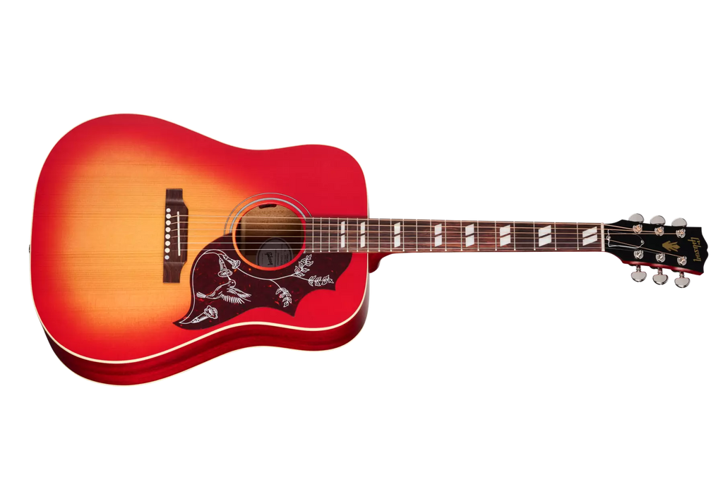 The "concert depth" body is slightly thinner than the body on a Hummingbird Standard, giving it a leaner and tighter bass response that sits perfectly in the mix and also makes it easier to hold. The utile neck is attached to the body with a compound dovetail neck-to-body joint, and like all Gibson acoustic guitars, it is affixed with hot hide glue. The neck has a comfortable Round profile, and the rosewood fretboard has a 12" radius and features pearloid parallelogram inlays, which is one of the visual hallmarks that makes the Hummingbird easily recognizable. The fretboard is fitted with 20 standard frets. The traditional belly-up rosewood bridge is equipped with a TUSQ® saddle, and the nut and bridge pins are also TUSQ. High-quality Grover® Rotomatic® tuners ensure rock-solid tuning stability. The pickguard features a simplified version of the world-famous Hummingbird pickguard graphics.