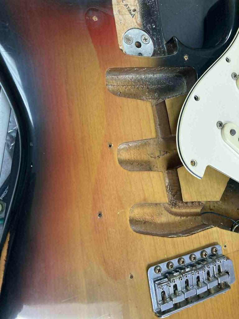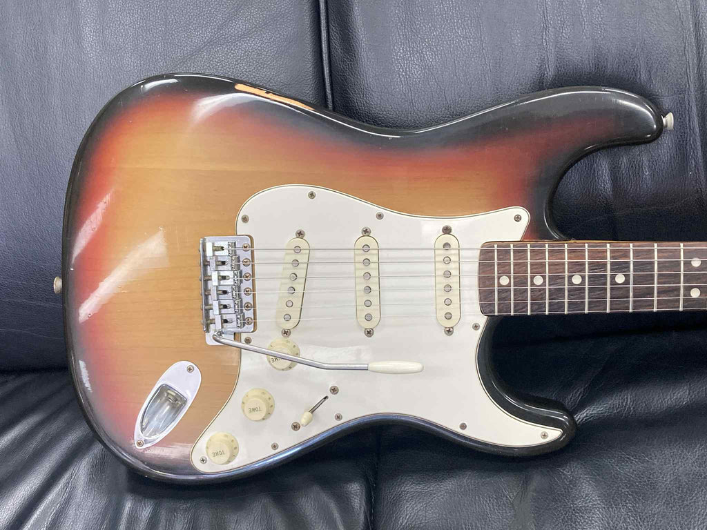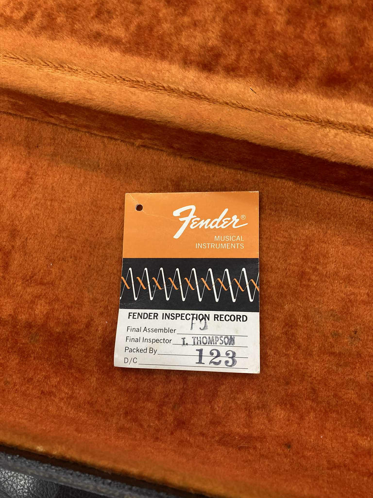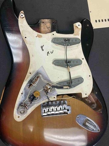 - Pickups and electronics: The guitar comes equipped with three gray-bottom single-coil pickups. Early 1970s models featured a three-way pickup selector switch, a master volume knob, and two tone knobs. It was a common modification for players to replace the original three-way switch with a five-way switch. This guitar still retains it's original 3-way switch.