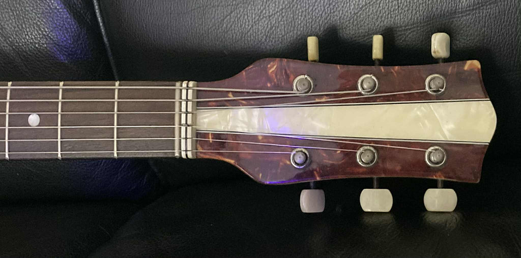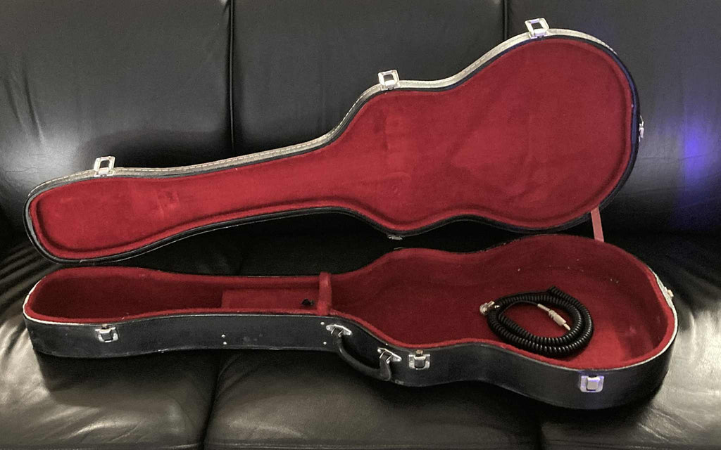 The guitar we have here has had the D string tuning key repaired with a different button, the pots and output jack have been replaced and the originals are in the case. We were told that the case is original, but cannot confirm. The original pickguard is missing, and the volume and tone knobs have been replaced with proper reproductions.