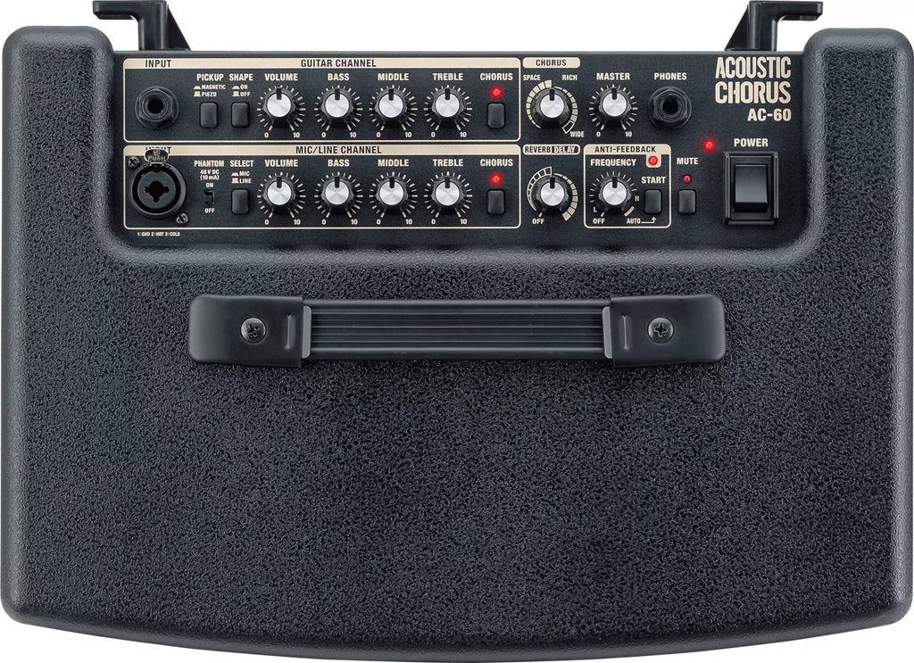 The dual-channel AC-60 offers both a Guitar channel and a Mic/Line channel with Phantom Power. This makes it the perfect companion for coffeehouses and small club gigs. The Guitar channel gives you a choice between piezo and magnetic pickup inputs, plus powerful Anti-Feedback controls. Rounding out this package is a Mute switch for silent tuning and a Stereo Line Out for connection to mixing consoles and PA systems.