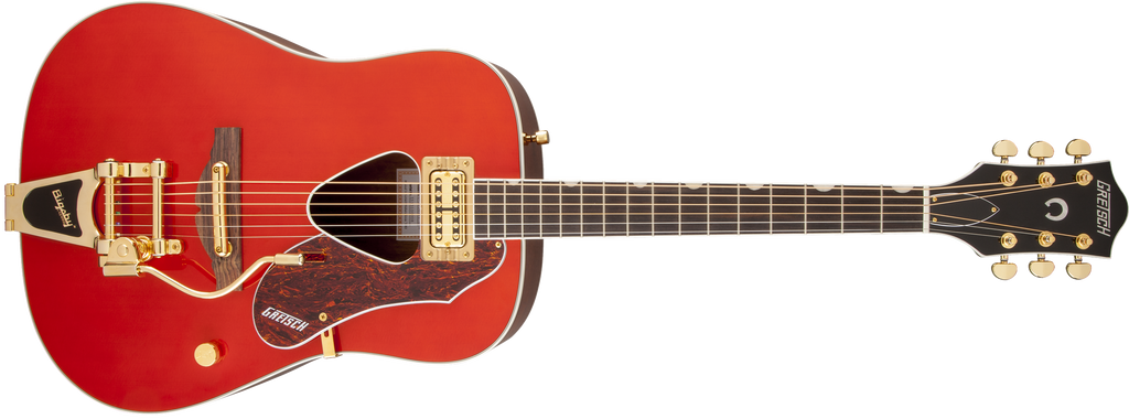 The G5034TFT Rancher dreadnought is one of the most distinctive Rancher models ever, with a sweet iso-chamber mounted Fideli'Tron™ pickup for great amplified tone and performance and a Bigsby® B70G tailpiece with a "wire" trem arm.
