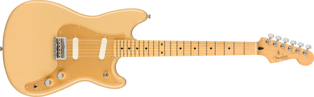 Almost infinitely flexible, the pair of Duo-Sonic single-coil pickups in the bridge and neck positions lends a unique character to for everything from bright, jangly arpeggios to heavy chords. Master volume and tone controls, along with a three-way pickup switch, shape the pickups' voice to match the music. The 24" scale adds a bit of warmth and thickness to the guitar's inherent tone, while granting a slinkier playing feel, making it easier to perform multi-step bends. Topped by a 9.5"-radius maple fingerboard with 22 medium jumbo frets, the "C"-shaped maple neck is comfortable for all playing styles and ideal for players with smaller hands, or those who use extended chord forms. The six-saddle string-through-body hardtail Strat® bridge increases sustain while the bent steel saddles add some zing to your tone, enhancing the upper harmonics to cut through a dense mix.